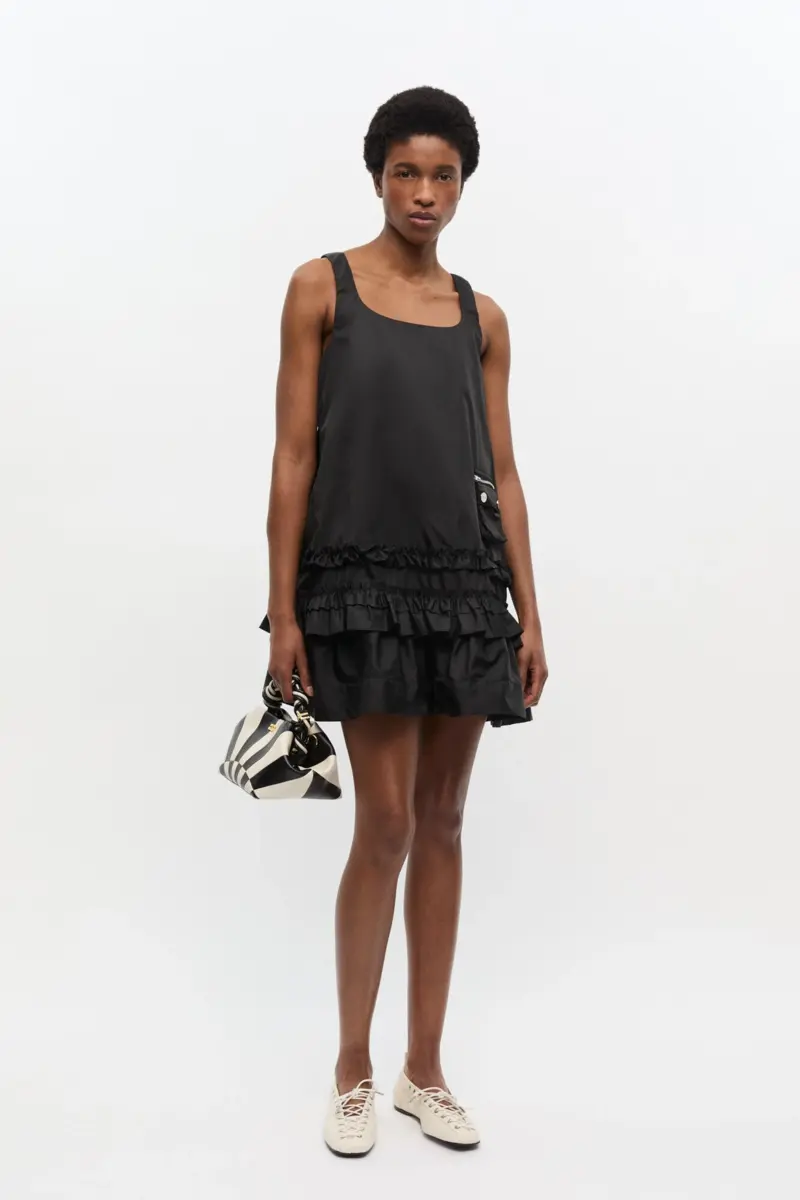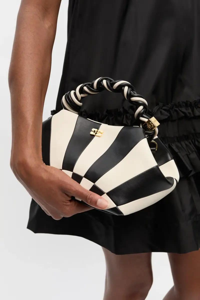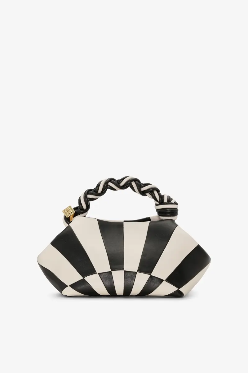 This bag features a hexagonal shape, a braided top handle with a braided knot and an adjustable and removable shoulder strap. The bag has an internal magnetic closure, an embossed logo