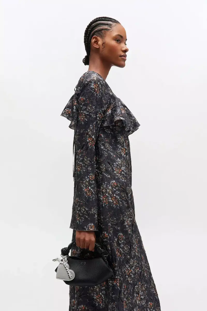 This bag features a tone-on-tone metallic GANNI Butterfly logo, a twisted handle with a braided knot, and a gold-tone metallic dice with a GANNI Butterfly logo engraved. The bag has an