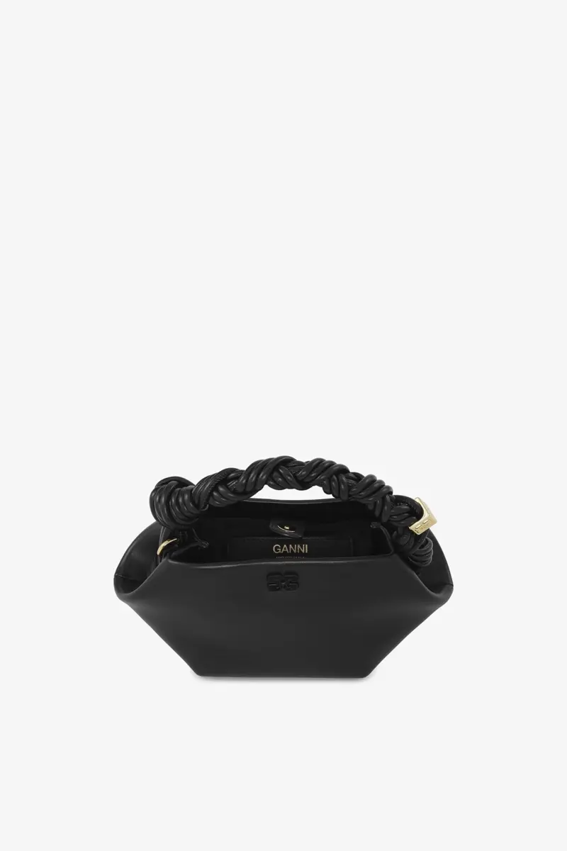 This bag features a tone-on-tone metallic GANNI Butterfly logo, a twisted handle with a braided knot, and a gold-tone metallic dice with a GANNI Butterfly logo engraved. The bag has an
