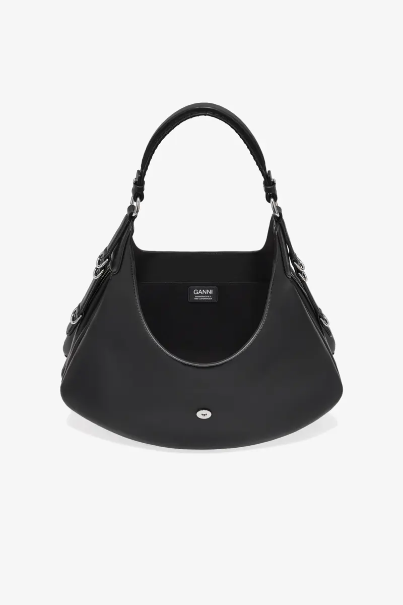 This bag features a accordian-style silhouette, a shoulder strap and D-ring detailing at the side. The bag has a closure tab with the signature GANNI Butterfly clasp in silver-tone, 1