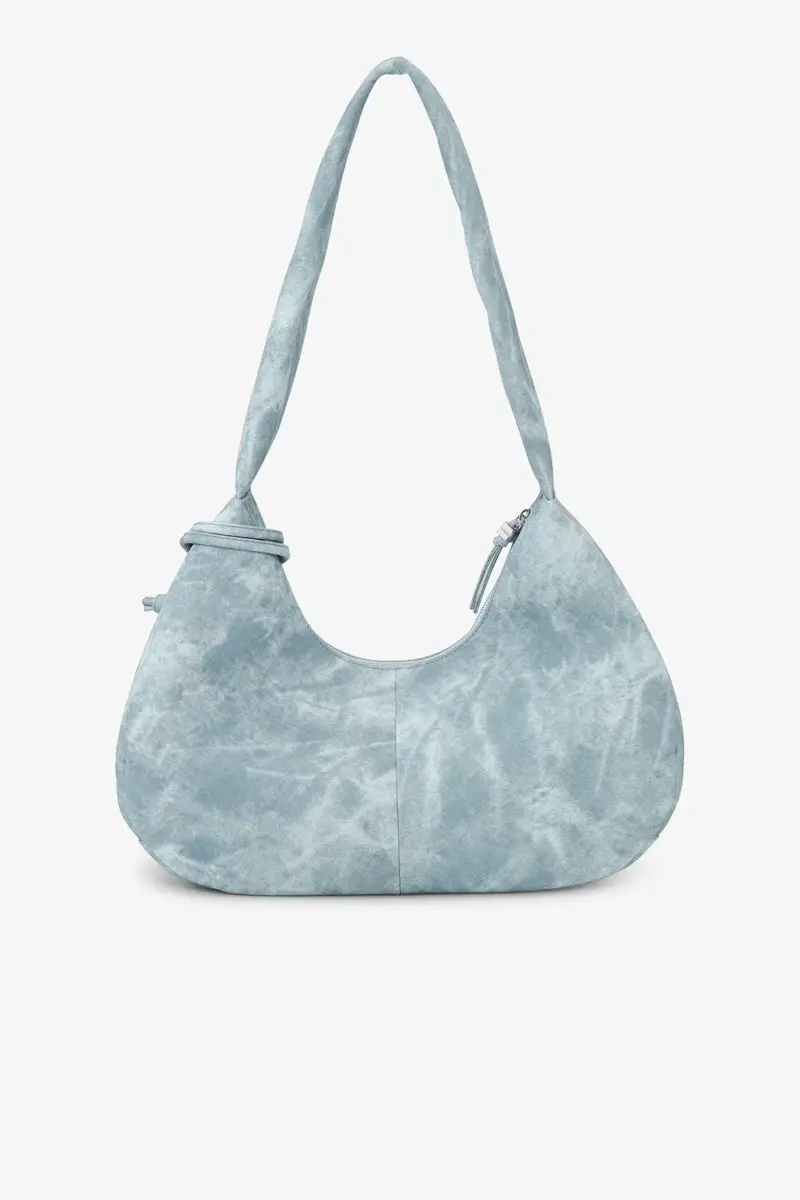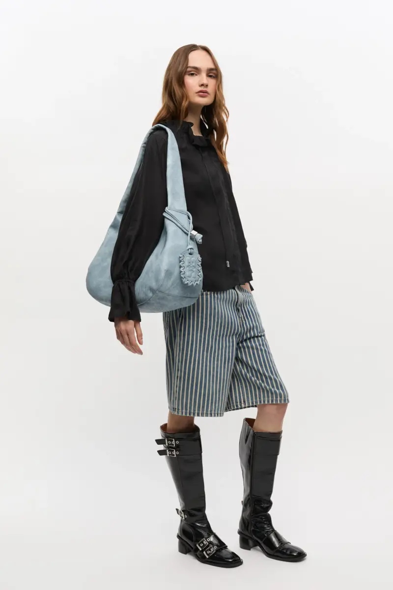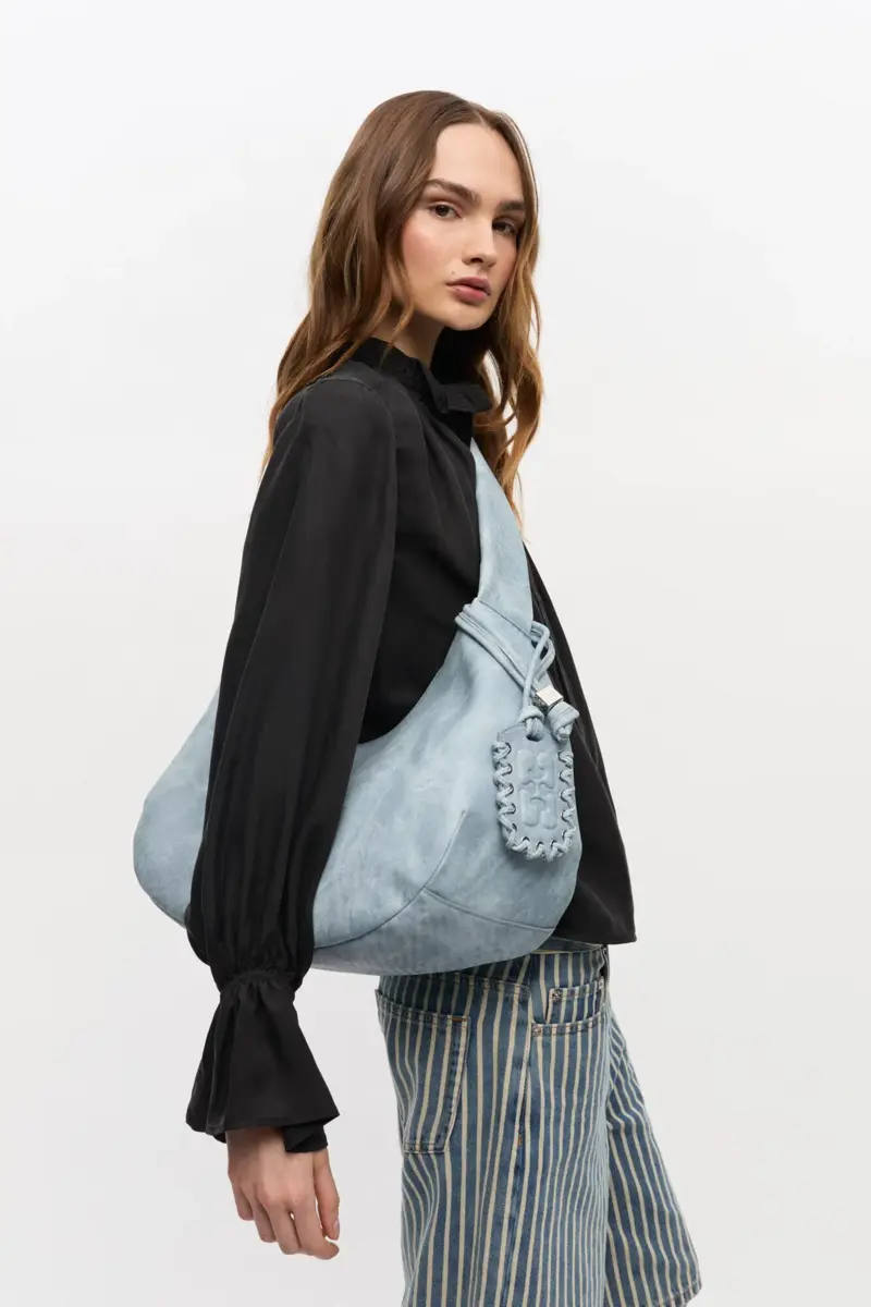 This bag features a bleached leather finish, a shoulder strap, a zip closing and silver-tone GANNI Butterfly logo. The bag has a mirror hangtag and inside zipped pocket.