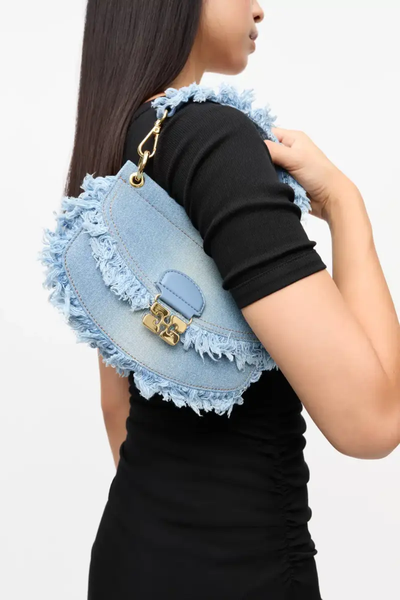 This bag features a structured silhouette, a top handle and an adjustable and removable shoulder strap. The bag has a magnetic closure with the signature GANNI Butterfly clasp in gold-