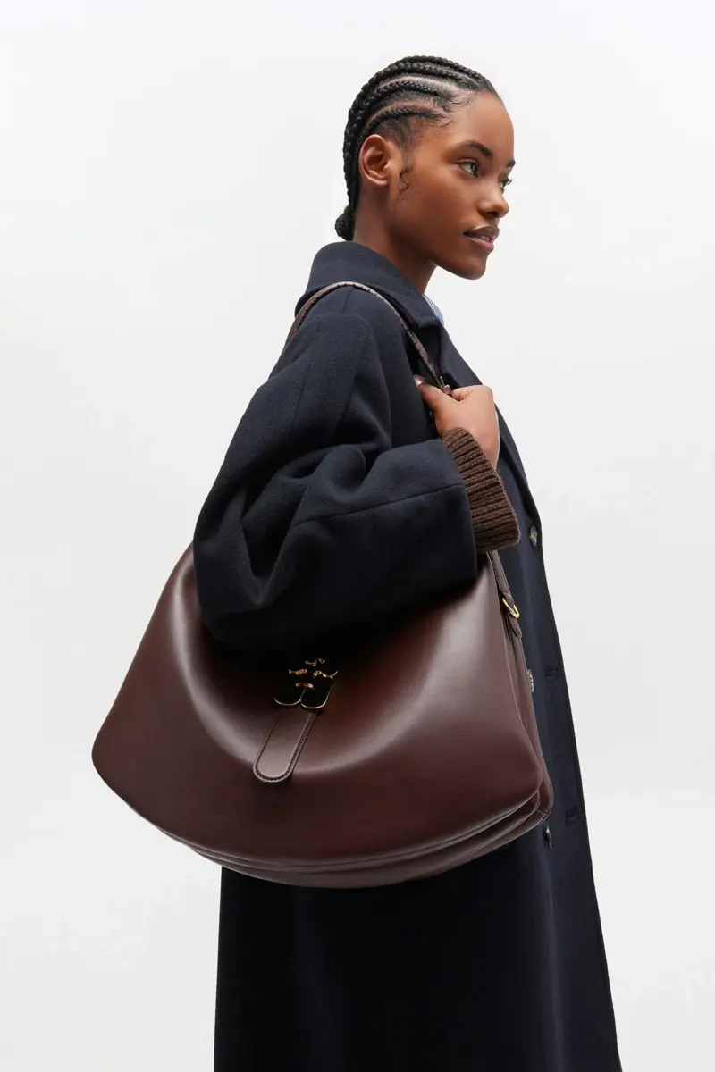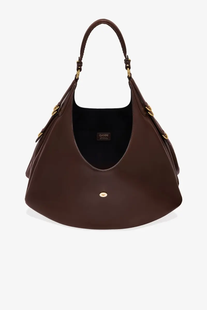 This bag features a accordian-style silhouette, a shoulder strap and D-ring detailing at the side. The bag has a tab closure with the signature GANNI Butterfly clasp in gold-tone, 1 ma