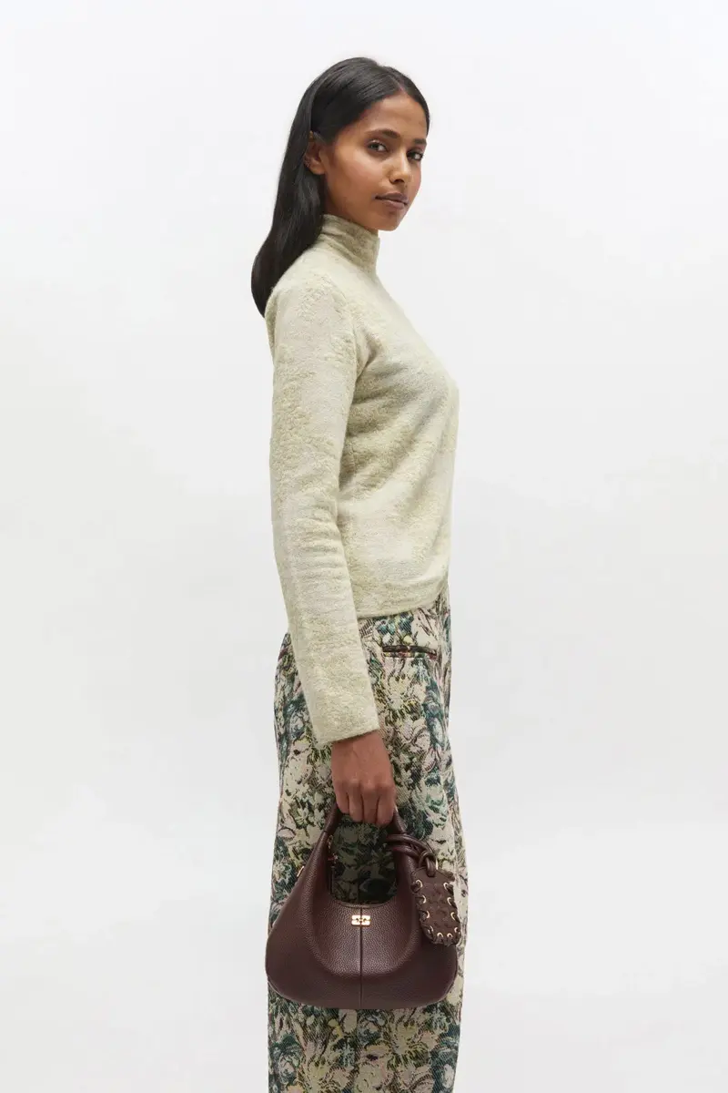 This bag features a top handle, adjustable and removable strap and a zipper closing. The bag has a mirror hangtag and an internal pocket.