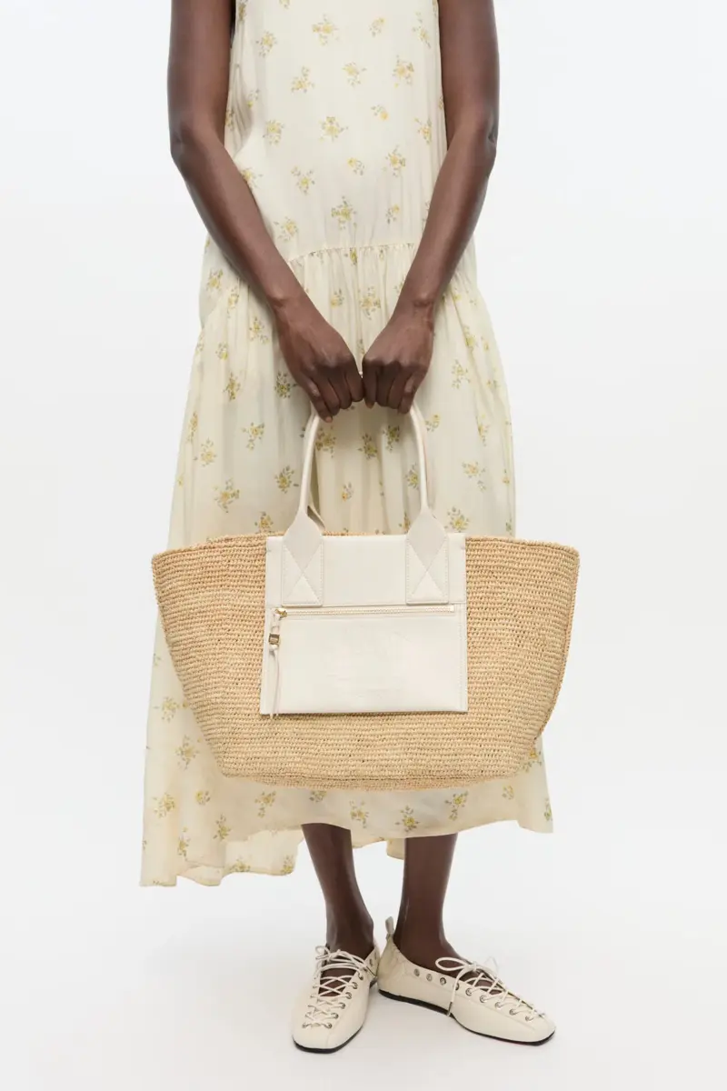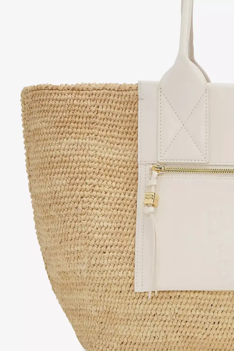 This tote features top handles and a front pocket with an embossed GANNI logo. The pocket has a zip closure and a pull tab with a gold-tone metallic dice. The outer material is made wi