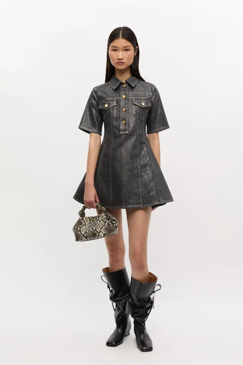 This bag features a tone-on-tone metallic GANNI Butterfly logo, a twisted handle with a braided knot, and a gold-tone metallic dice with a GANNI Butterfly logo engraved. The bag has an