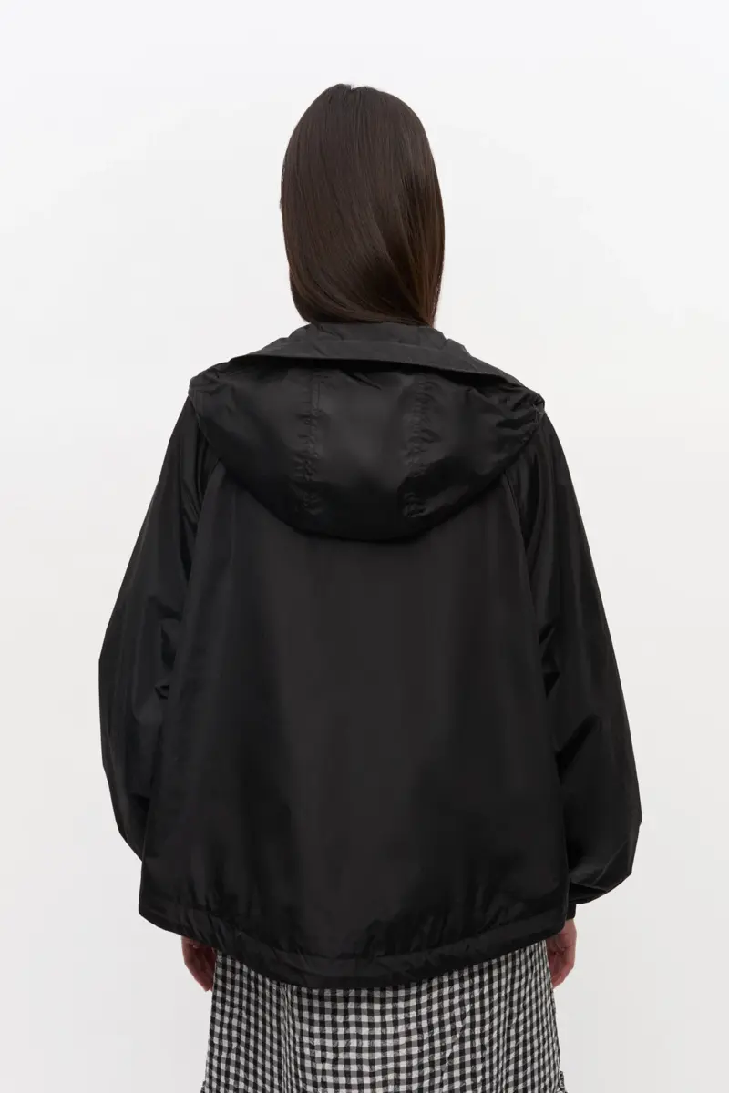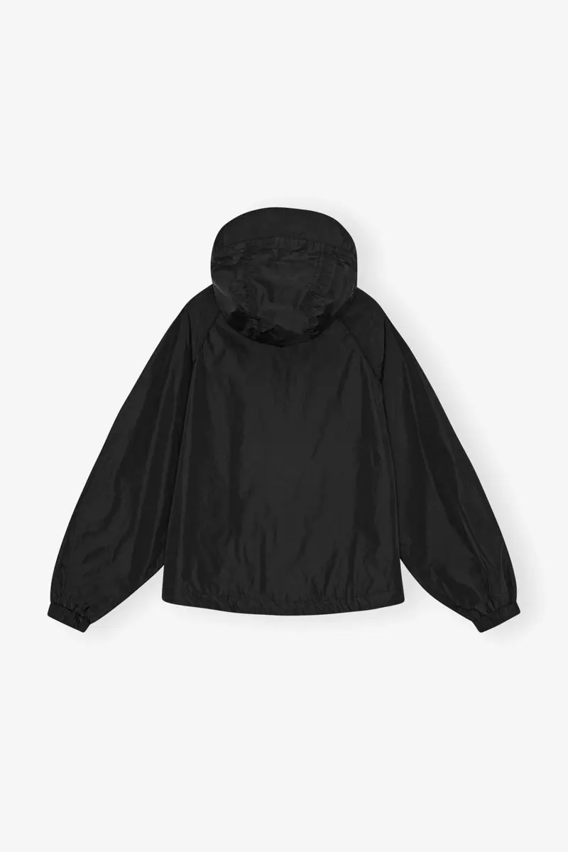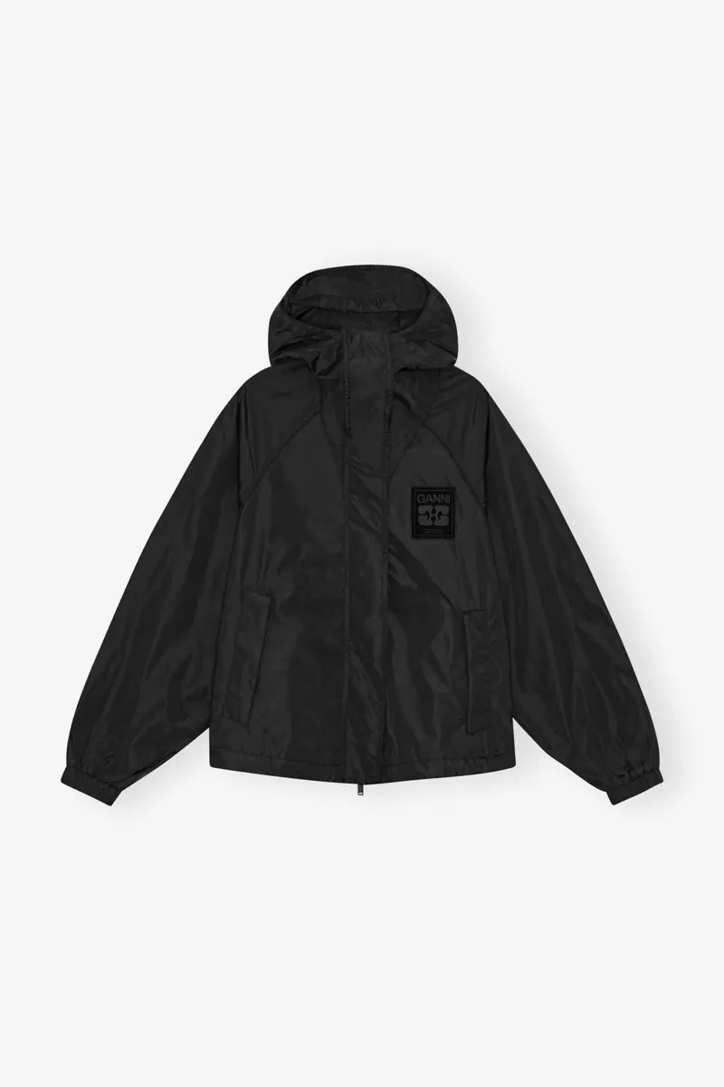 This jacket features a hood and a front zipper closure. The jacket has a patch with a GANNI logo on the chest.