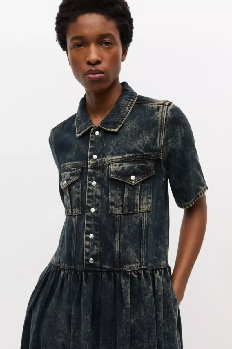 This dress features a classic collar, short sleeves, button front closure and 2 chest pockets.