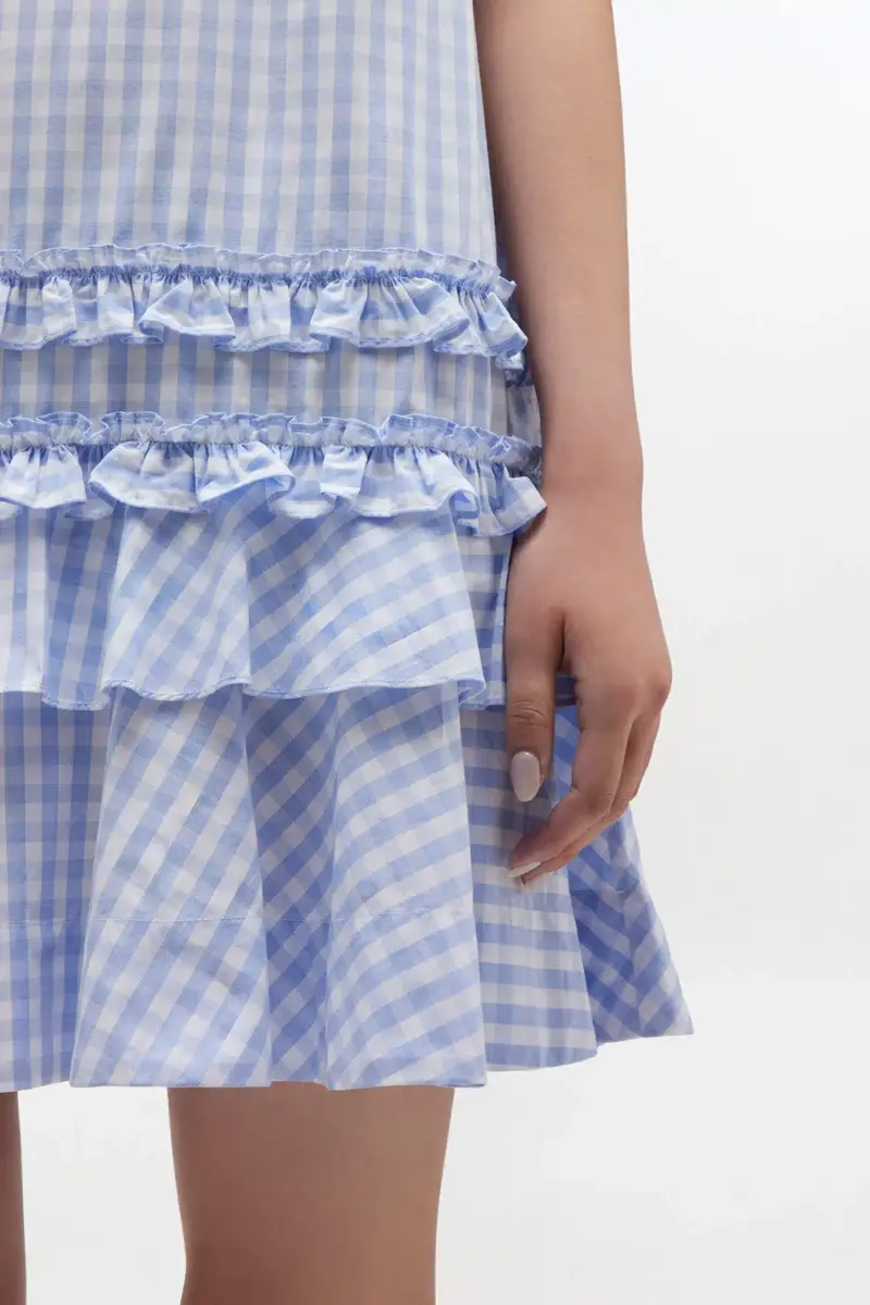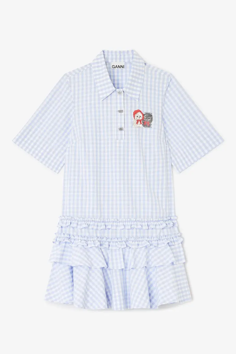 This dress features a check print, a classic collar, buttoned opening, ruffled hem and GANNI logo on the back.