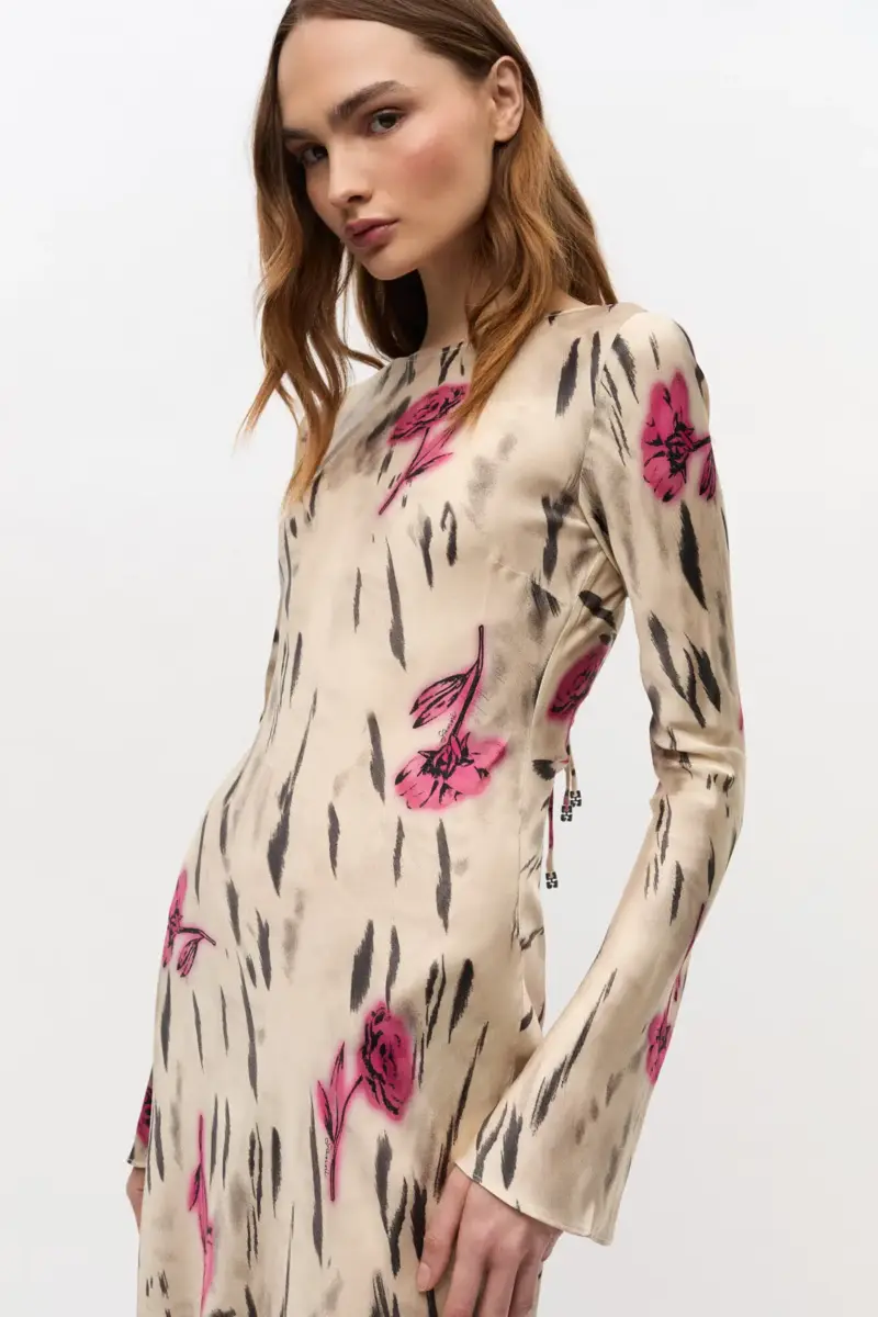 This dress in floral printed stretch satin has a round neck, long sleeves and an open back with tie strings.