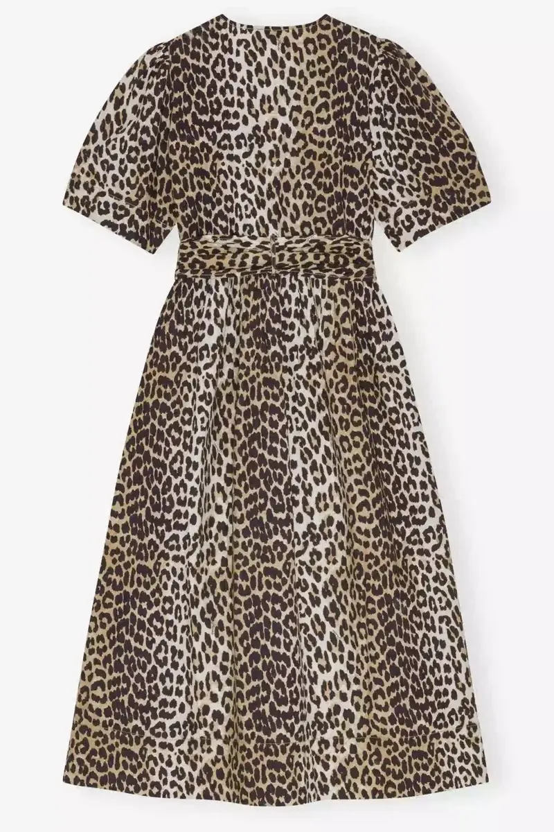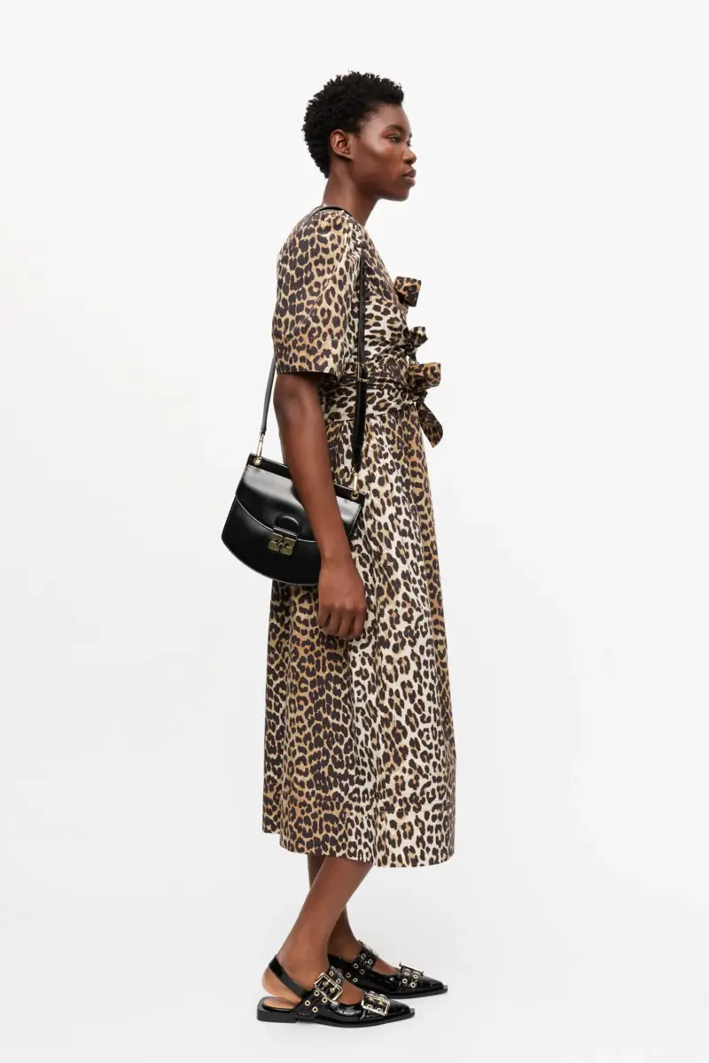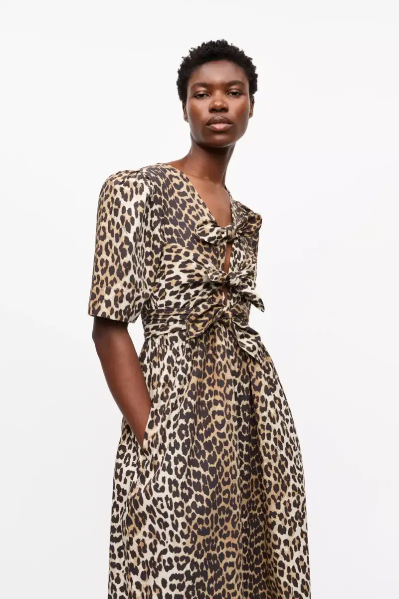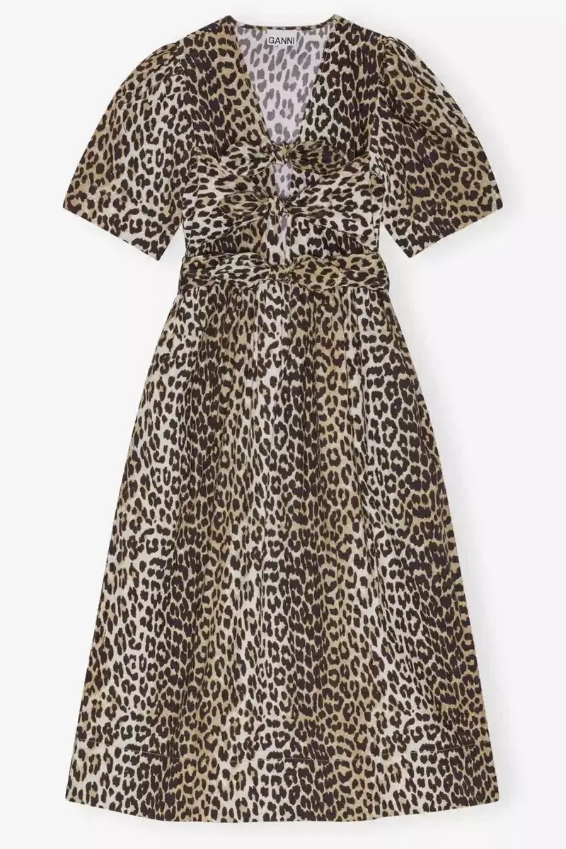 This Leopard Printed Cotton Tie Strap Midi Dress features a deep v-neckline, three tie bands at the front and short sleeves.