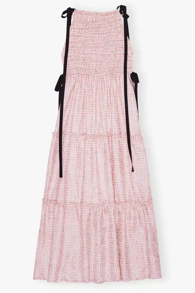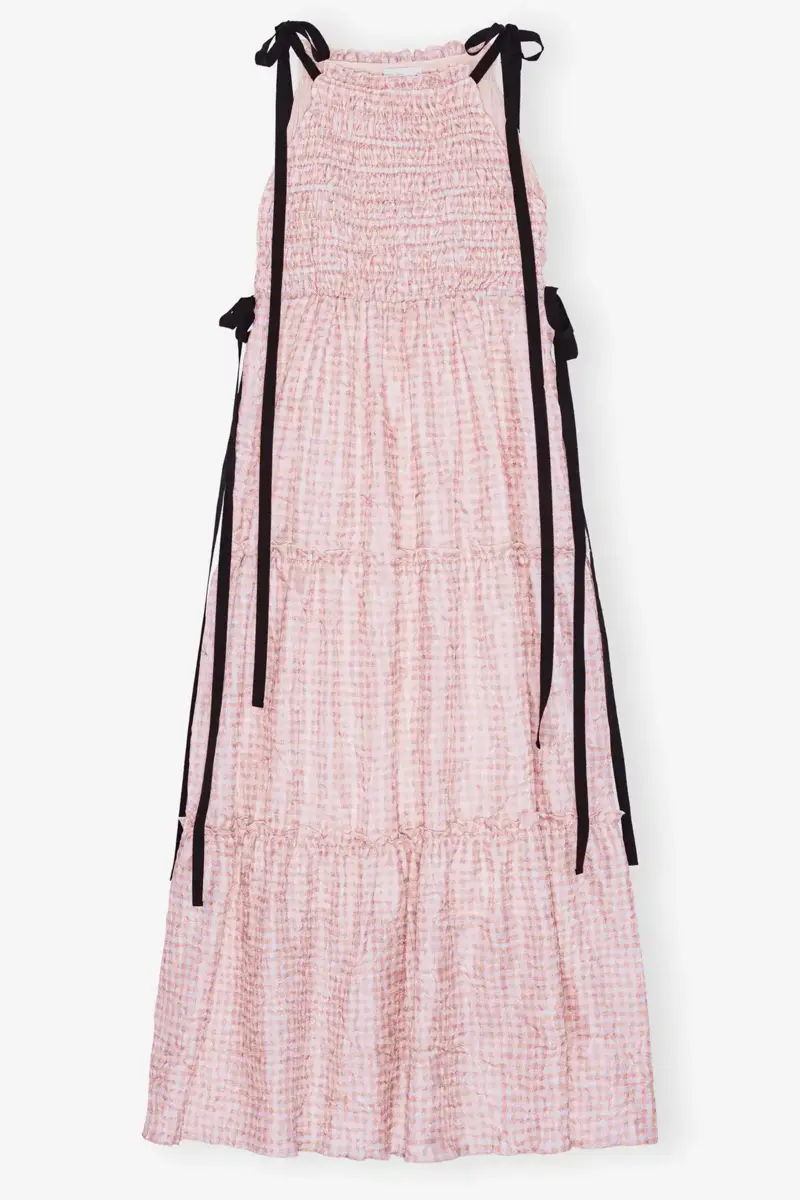 This dress features a textured check print, adjustable black ribbon ties at the shoulders and a tiered skirt.