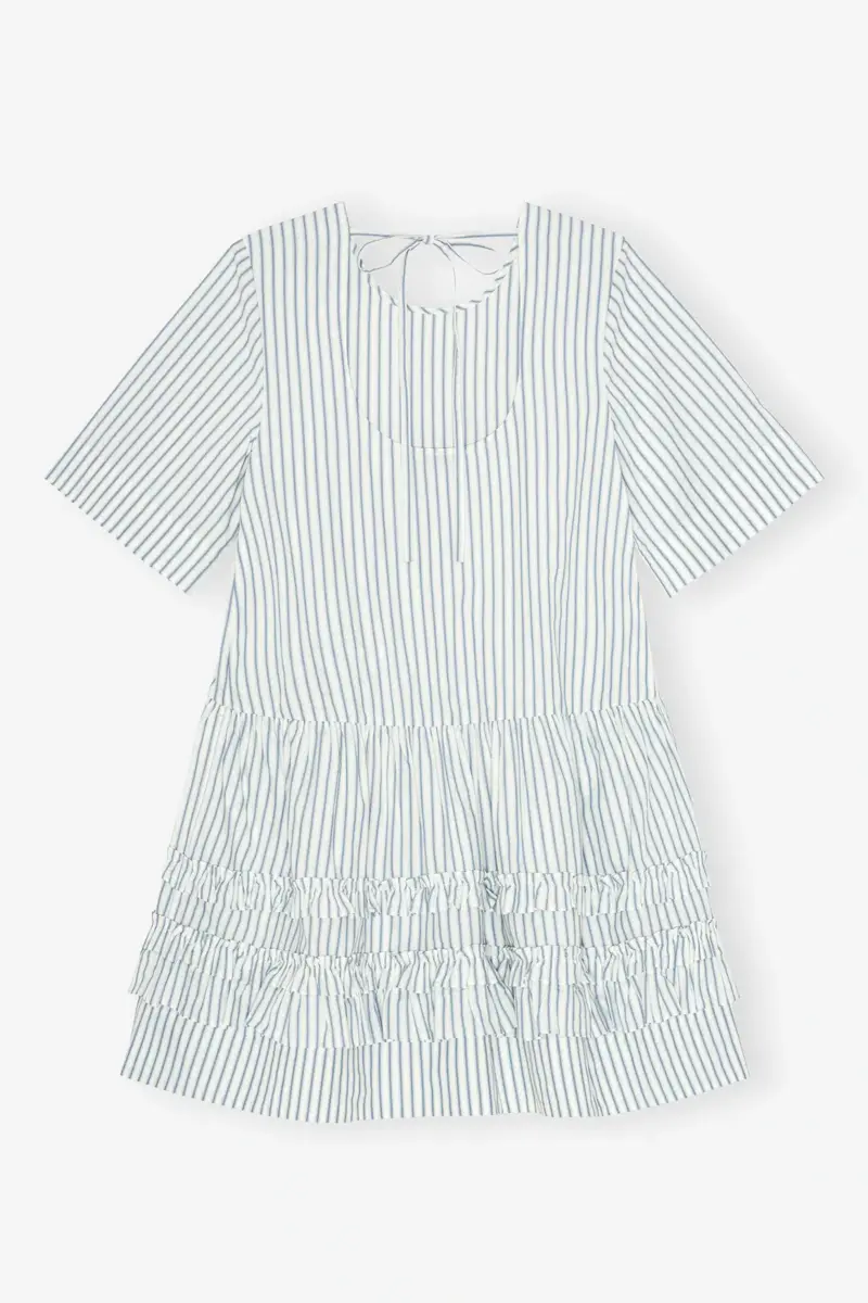 This mini dress features a white and blue striped pattern, a round neckline, and short sleeves.
