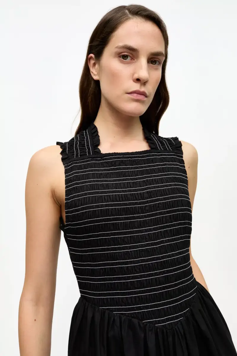 This dress features a straight neckline with wide smock straps, a smock bodice, cut-out detail at the back and a flared skirt.