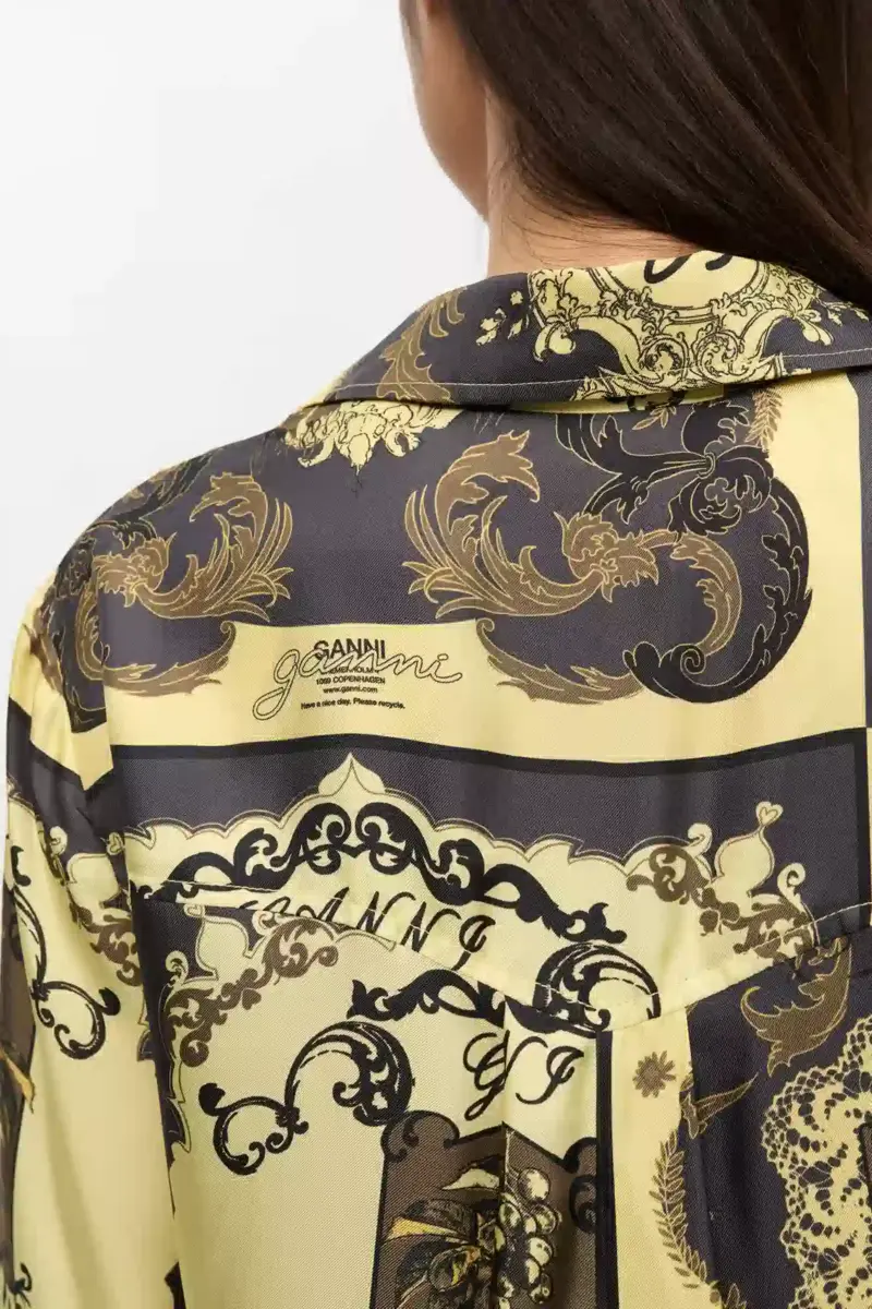 This dress features an ornate print. The dress is crafted from a silk satin fabric and has a button-down front and a matching belt.
