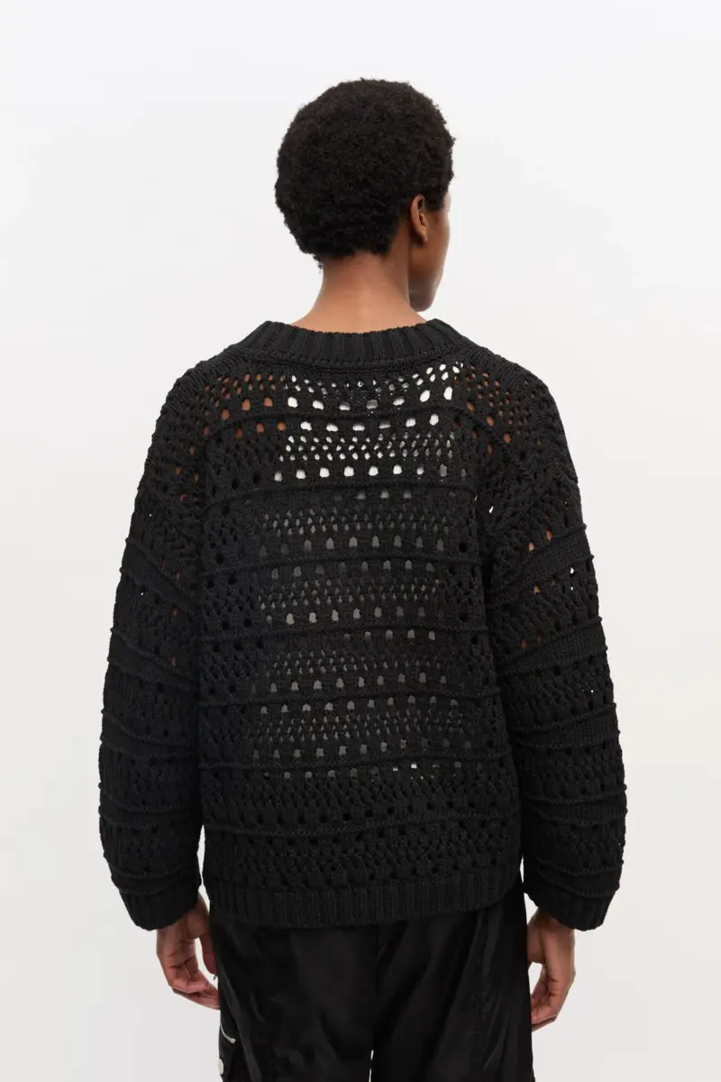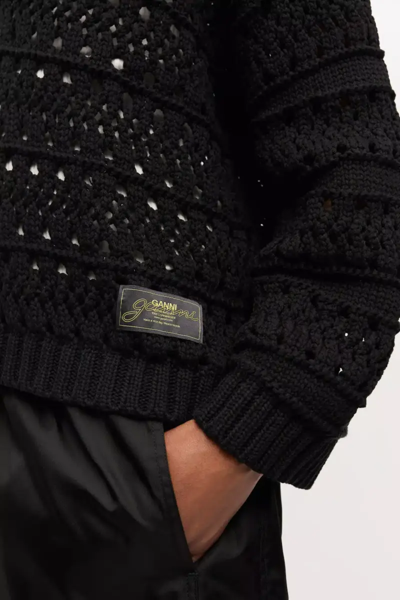 This jumper features a V-neckline with ribbed detailing on the neckline, cuffs, and hem, and a GANNI logo patch on the lower left side.