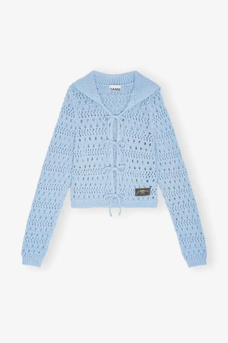 This Blue Tie String Cardigan features a large collar, three tie bands at the front and a sewn-on GANNI logo patch.