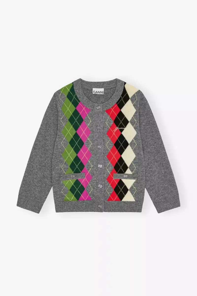 This cardigan features a check pattern in multiple colours. It has a silver-tone button closure, two front pockets and an embroidered GANNI logo.