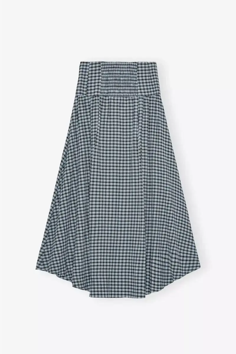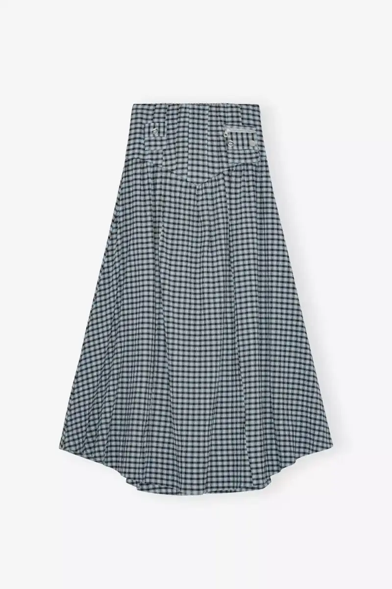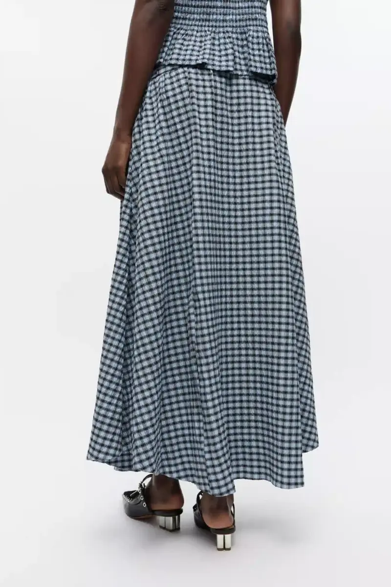 This Blue Seersucker Check Long Skirt Skirt features two front pockets and a dropped waist.