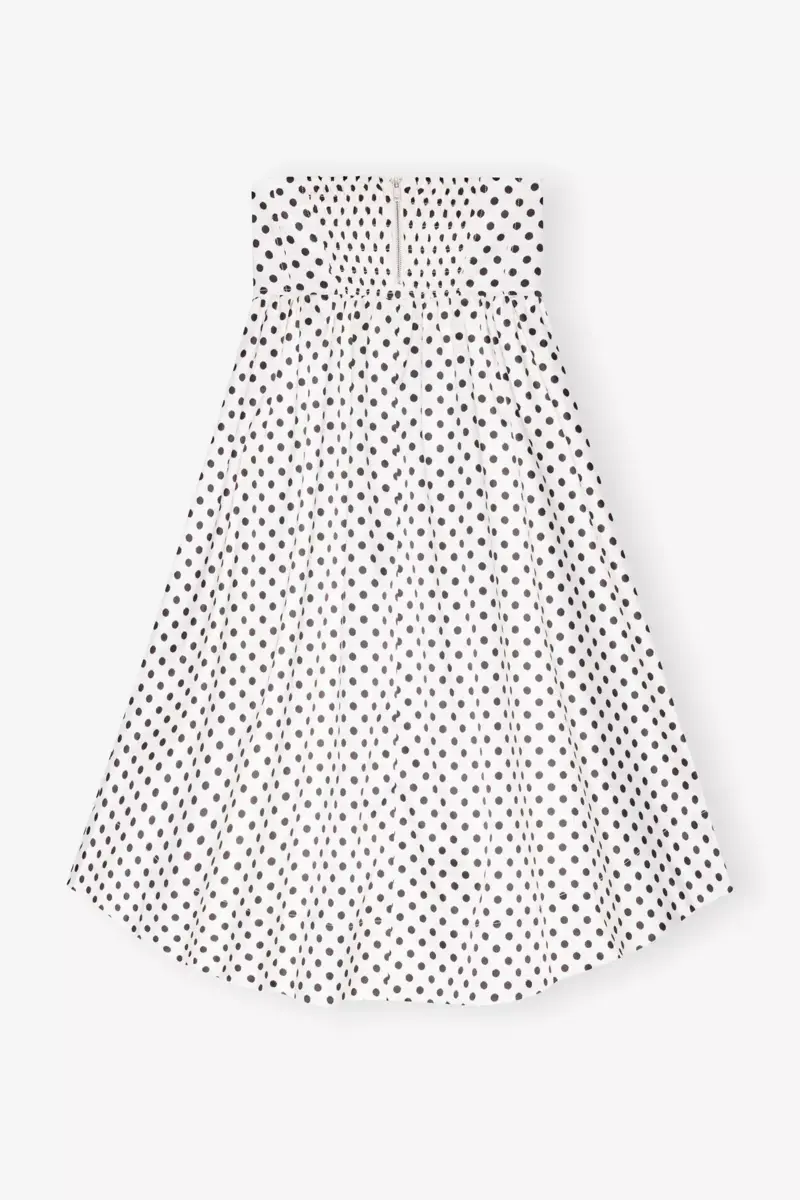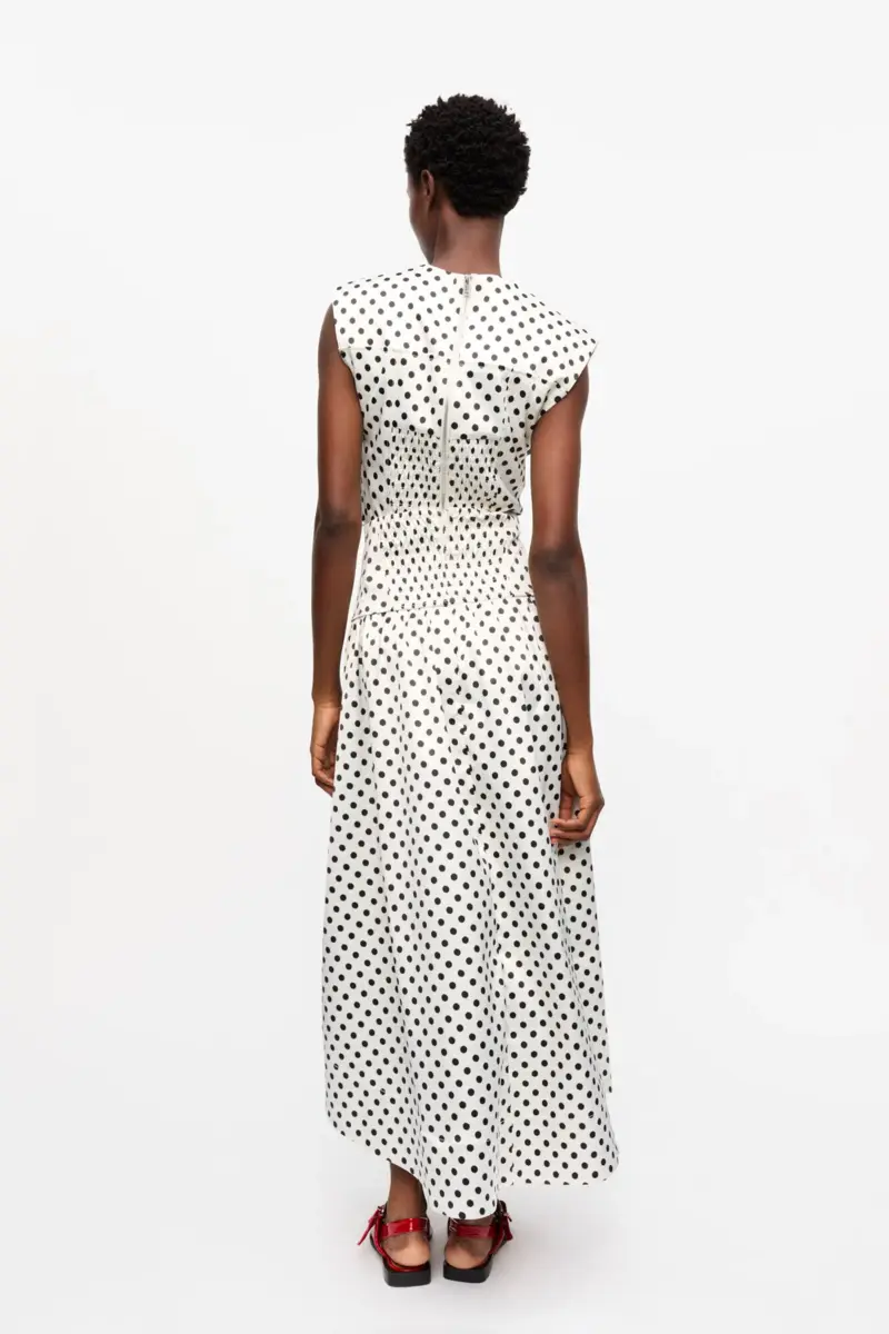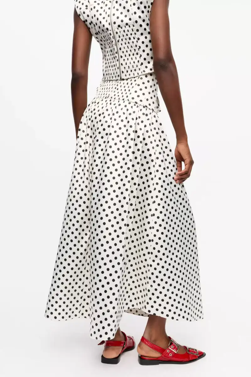 This Polka-dot Double Satin Long Pocket Skirt features a zip closure and front pockets.