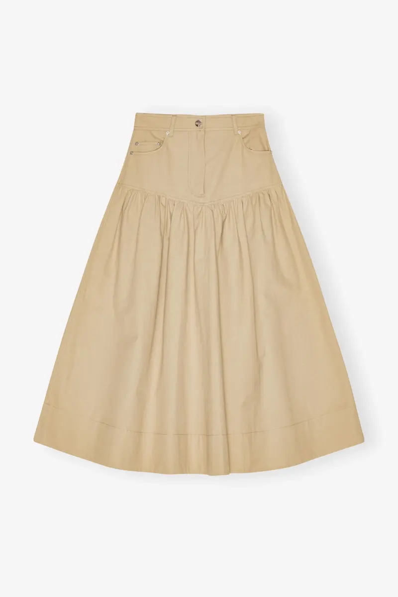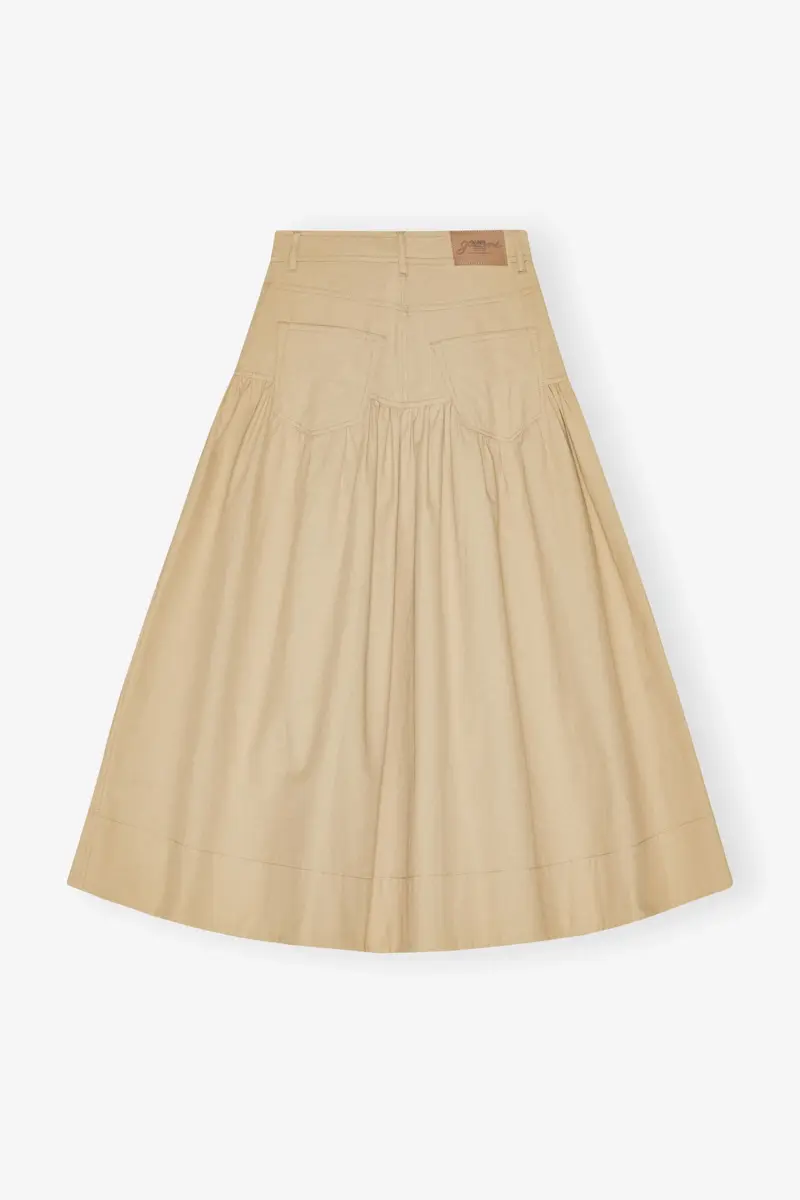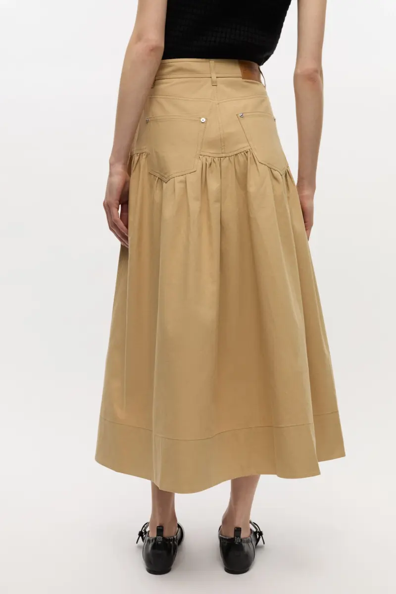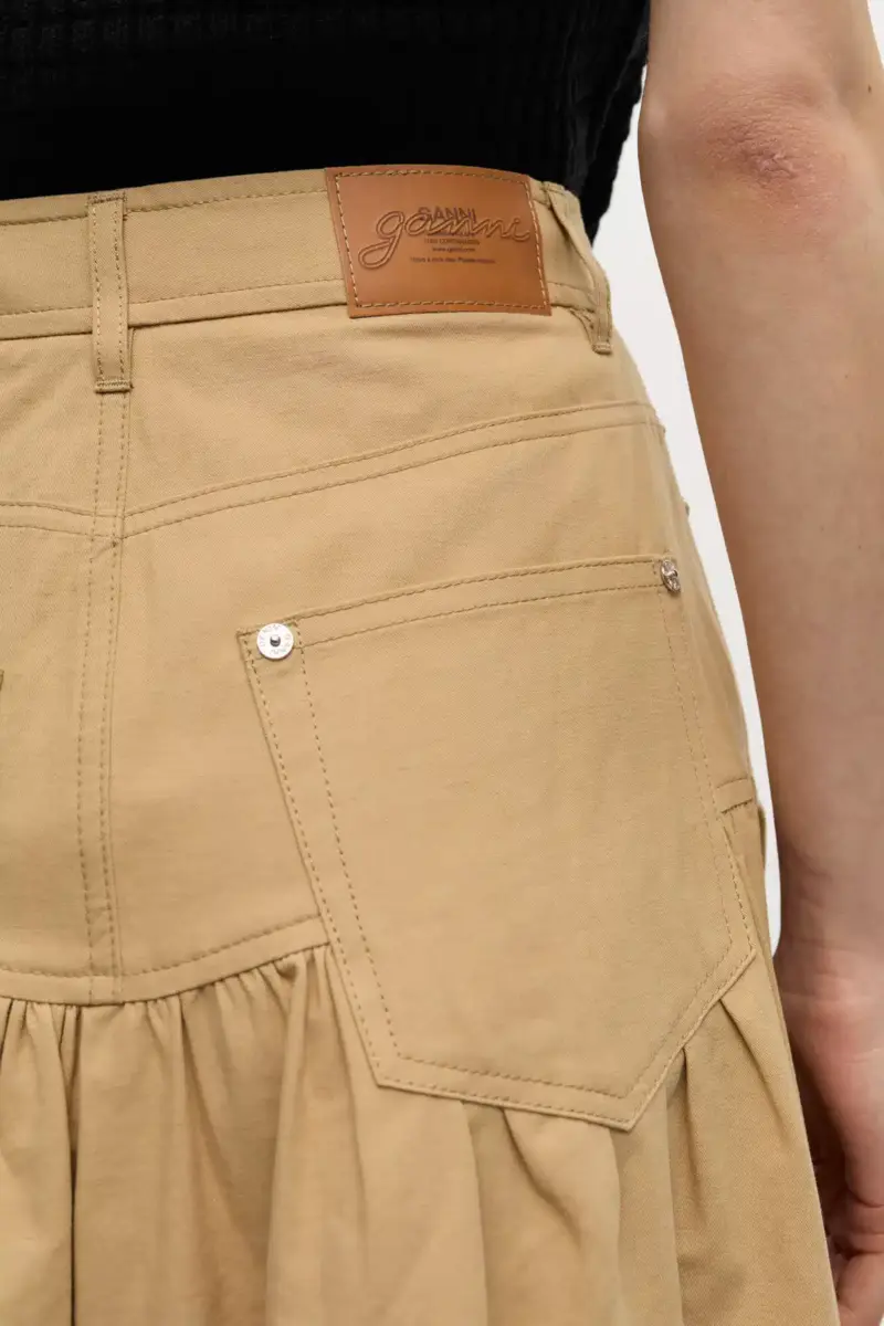 This skirt features a zip and button closure, 5 pockets, GANNI logo patch and a drop waist with ruching.