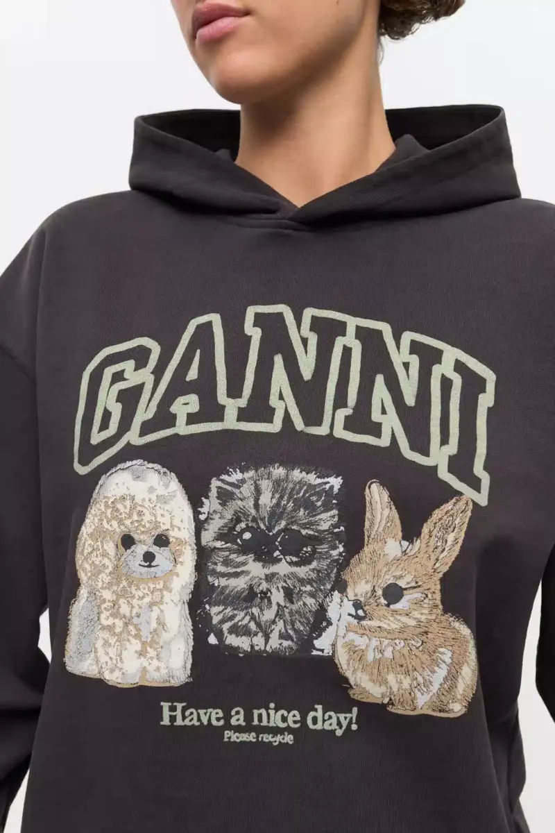 This hoodie features long sleeves with ribbed cuffs. The hoodie has a animal print graphic with a dog, cat, and rabbit on the front, and a ‘Have a nice day! Please recycle!’ message.