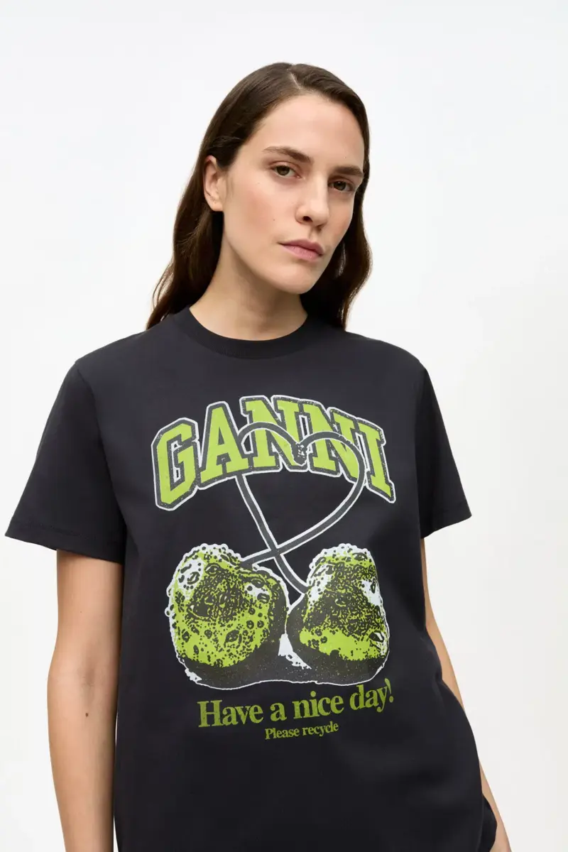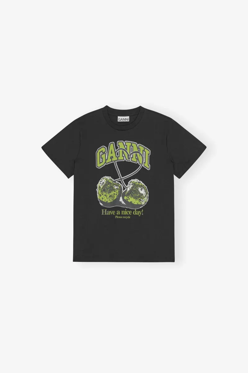 This Black Basic Jersey Green Cherry Relaxed T-shirt features a crew neckline, short sleeves and a graphic GANNI print.