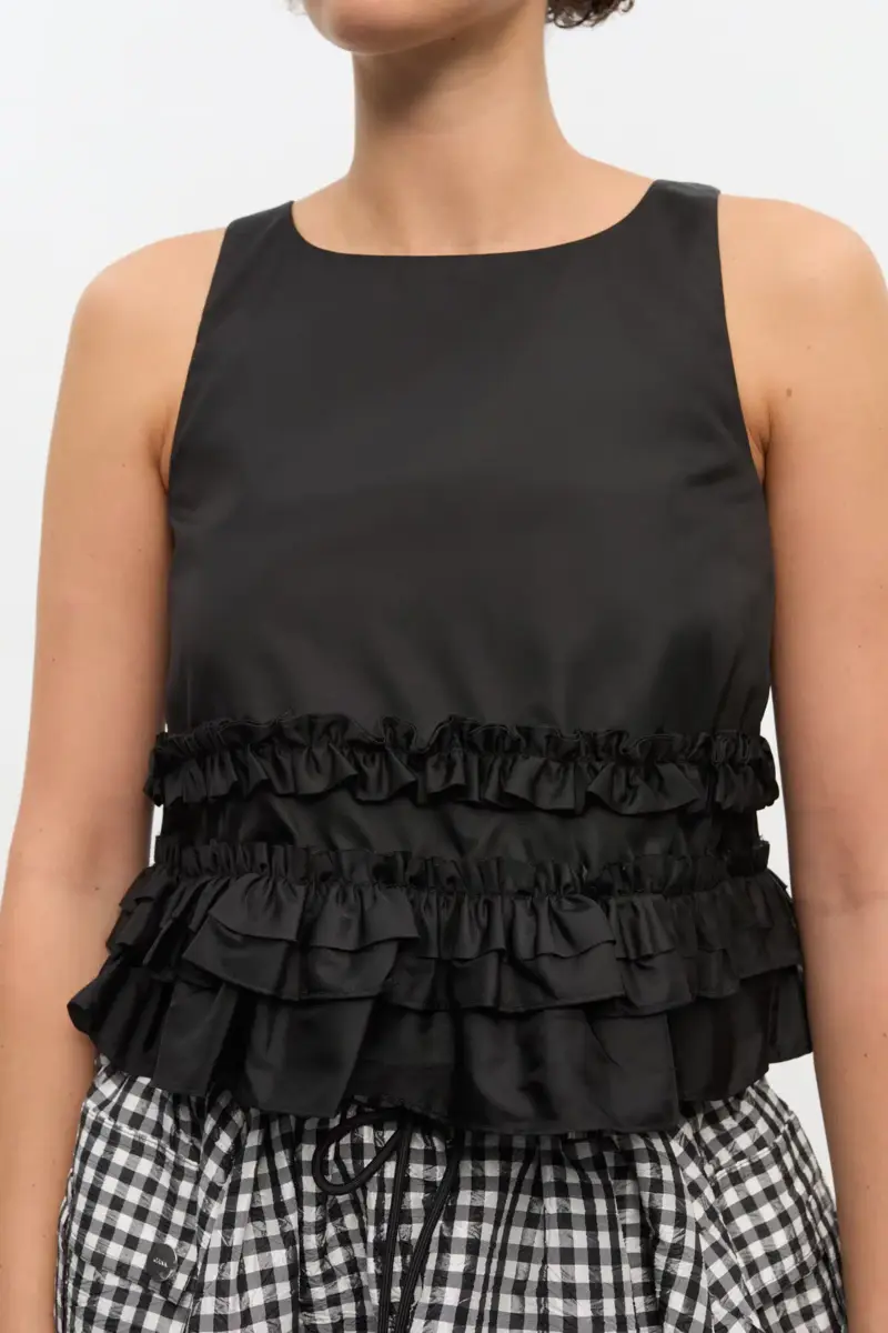 This top features a U-neckline, a ruffled hem and an open back with a tie closure.