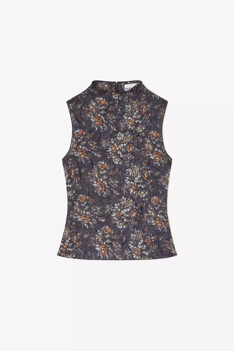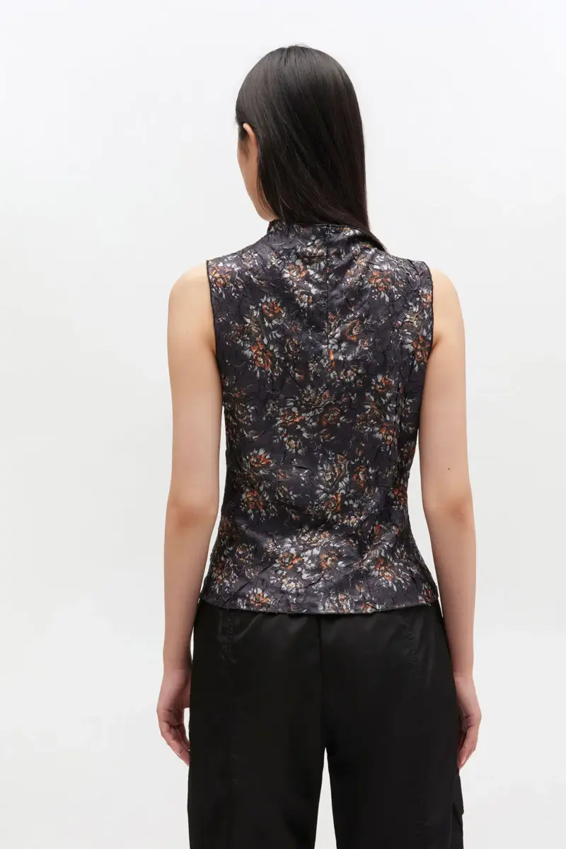 This top features a romantic floral print, shibori pleat finish, a high neck and zipper closure at back.