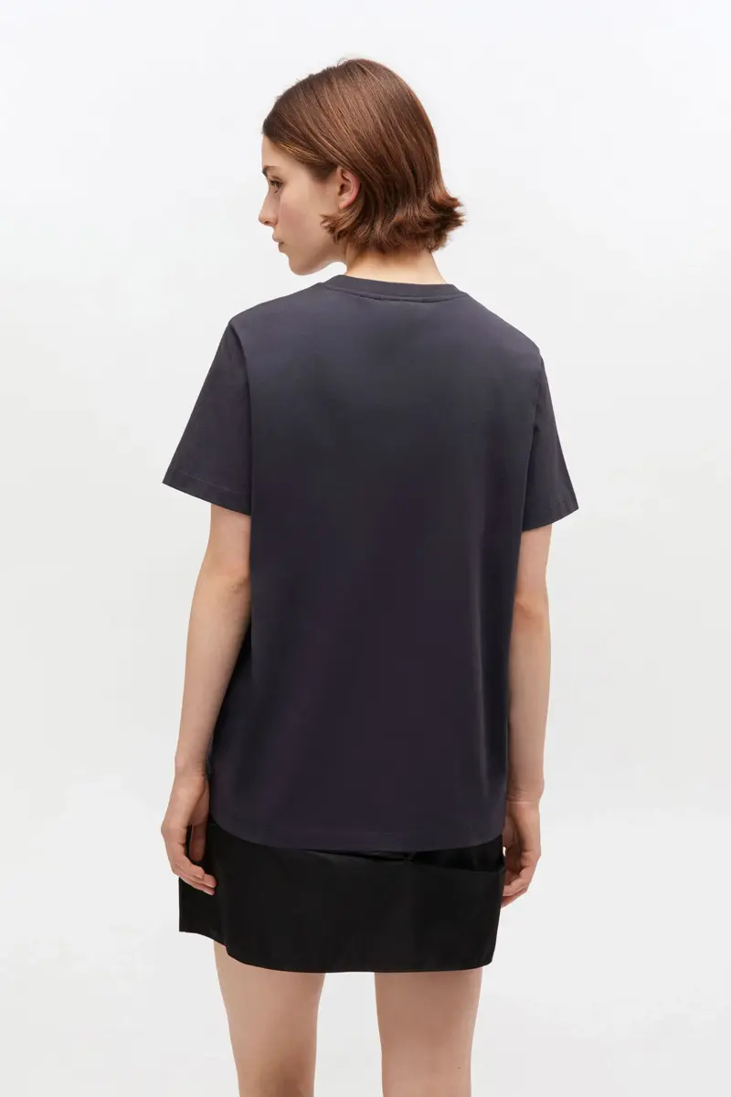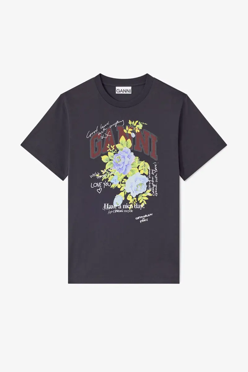 This T-shirt features a round neckline, short sleeves, and a GANNI logo. The T-shirt has a rose print graphic and a ‘Have a nice day! Please recycle’ message.