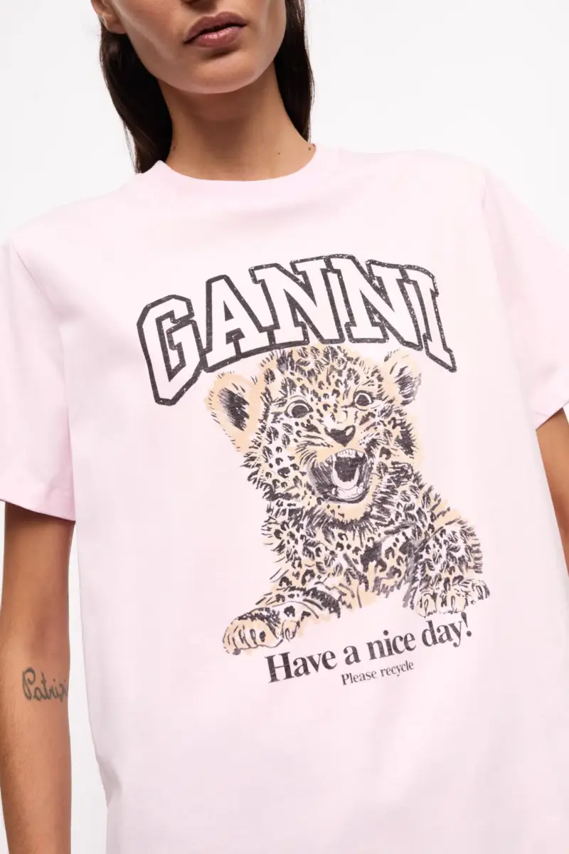 This T-shirt features a graphic of a leopard cub, a GANNI logo and the phrase ‘Have a nice day! Please recycle.’ The tee has a round neckline and short sleeves.