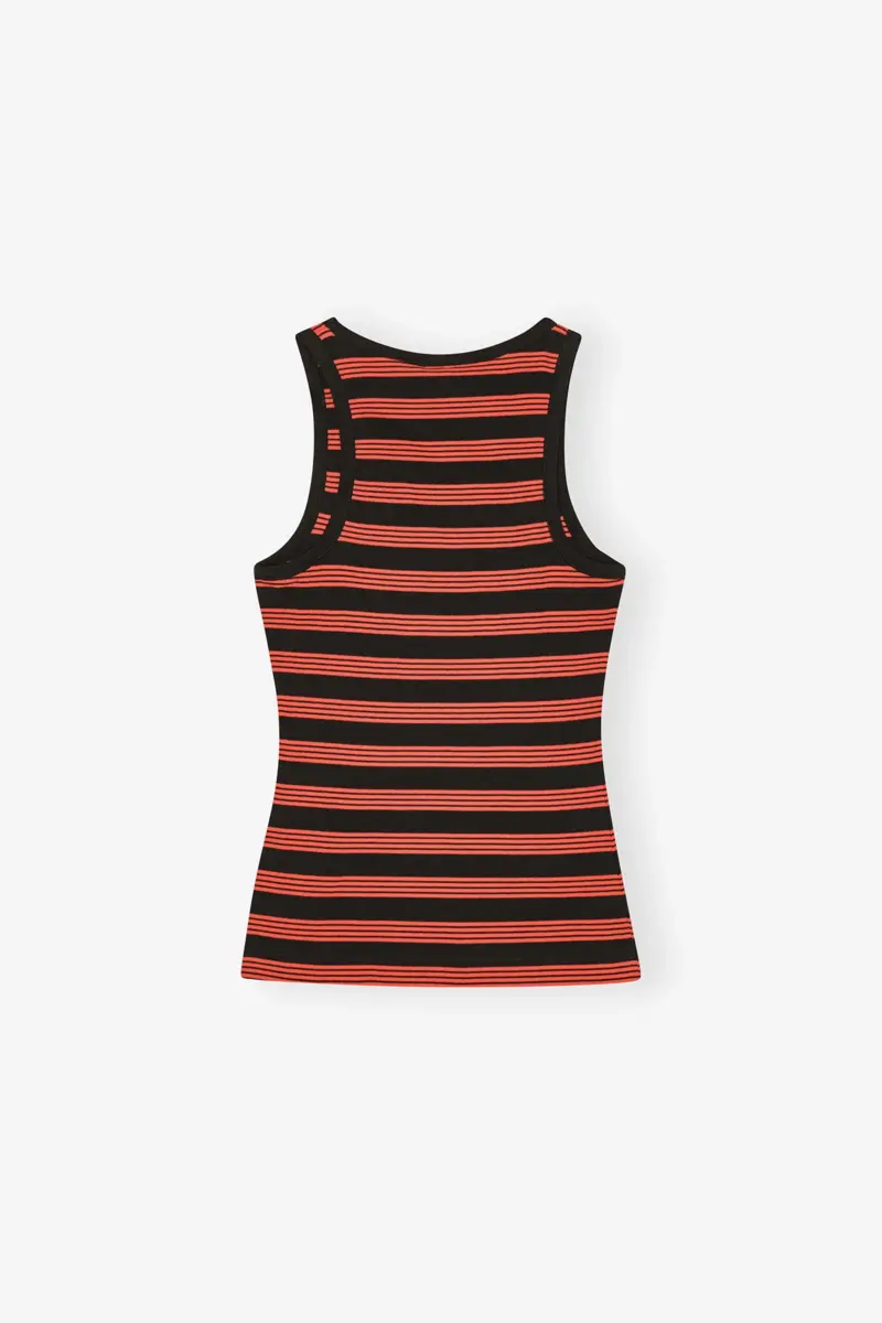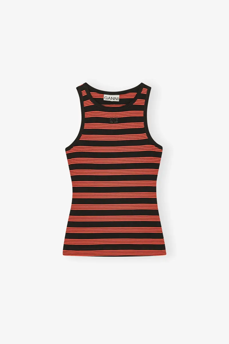 This top features a red and black striped pattern, a racerback and a GANNI Butterfly logo.