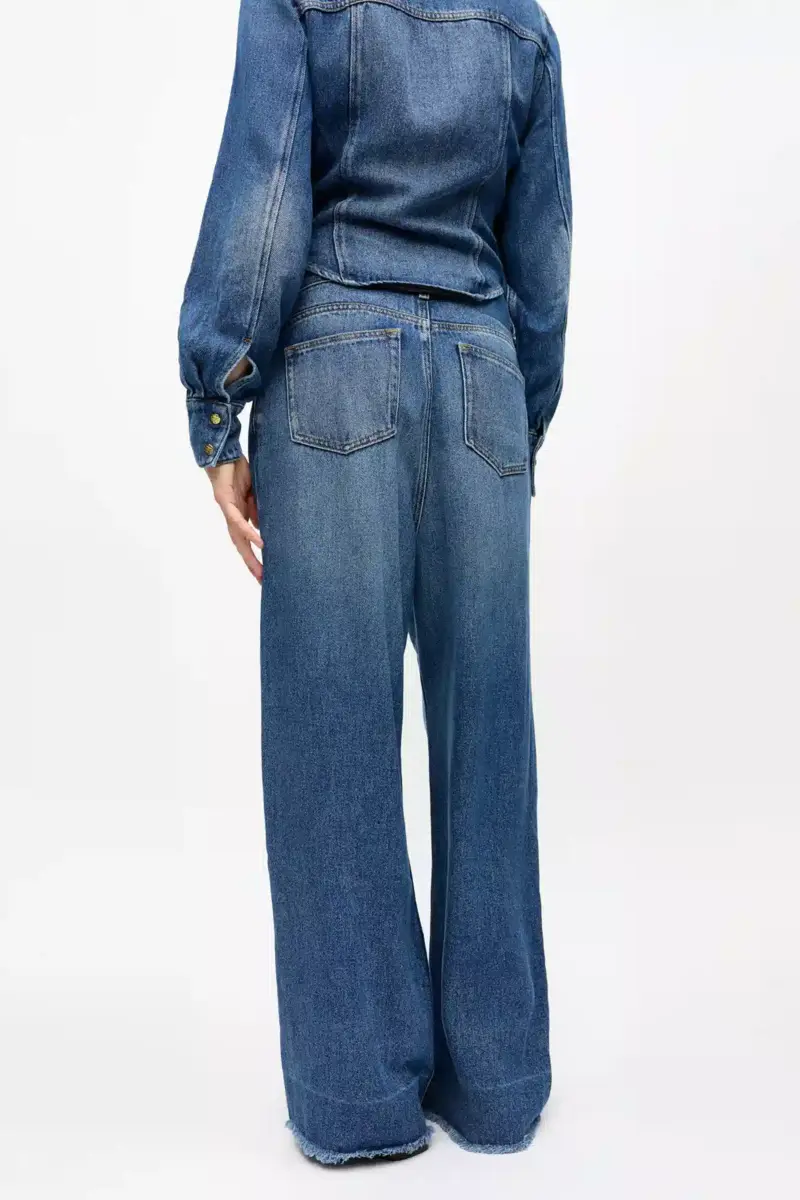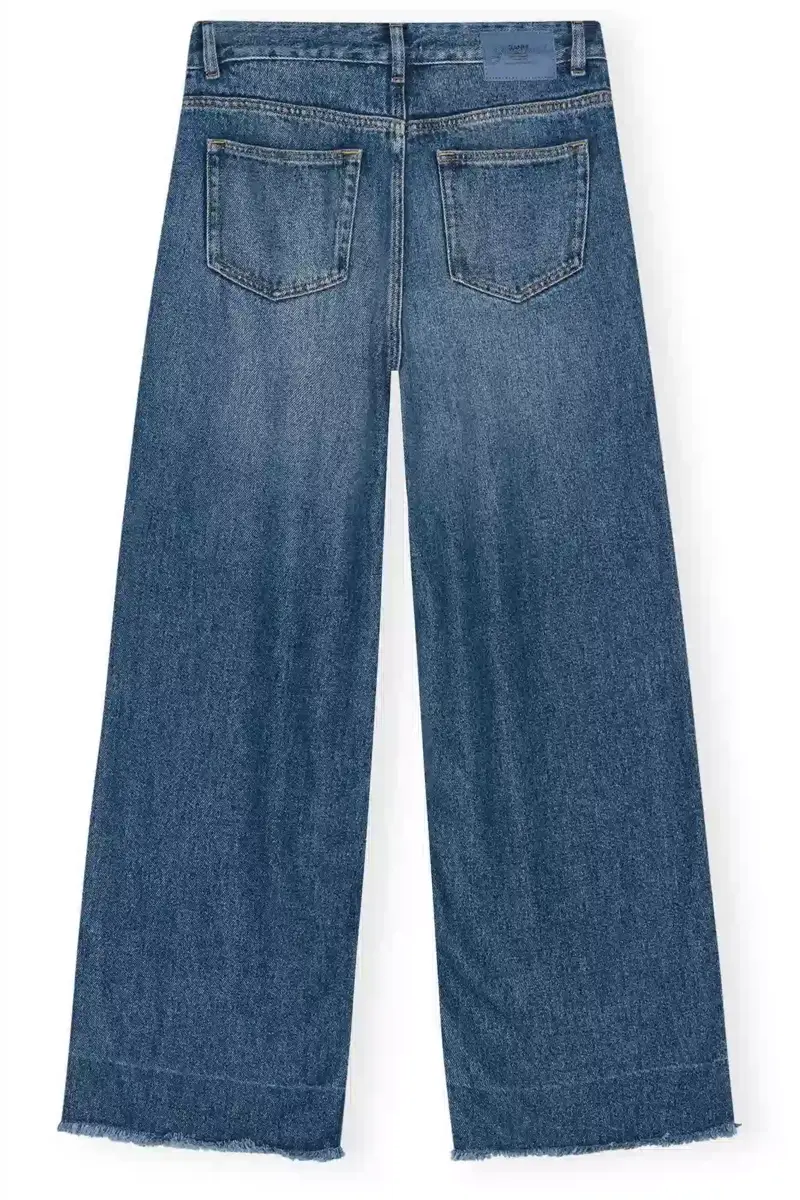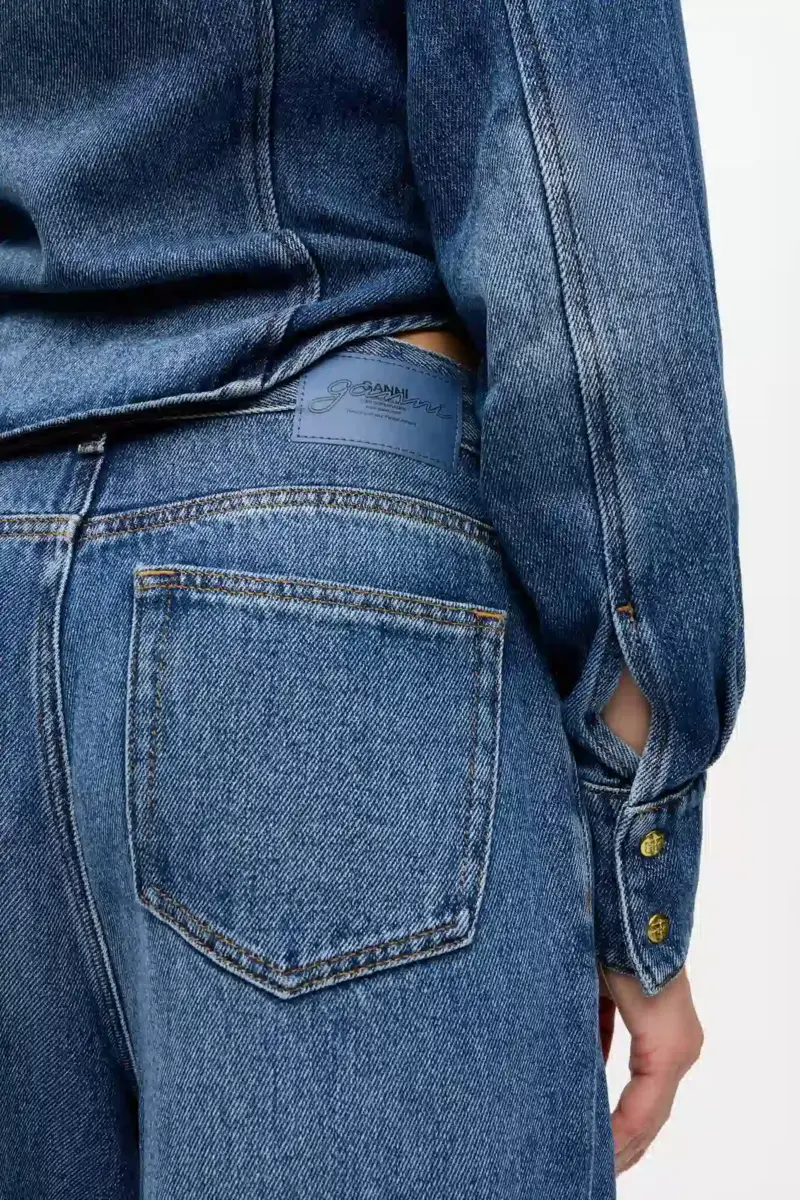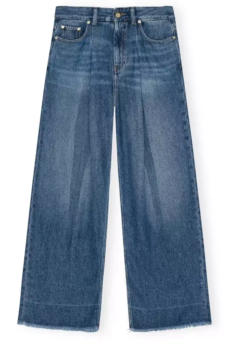 These jeans in denim feature a zip and button closure, 5 pockets, belt loops, GANNI logo patch and a pleated front detail.