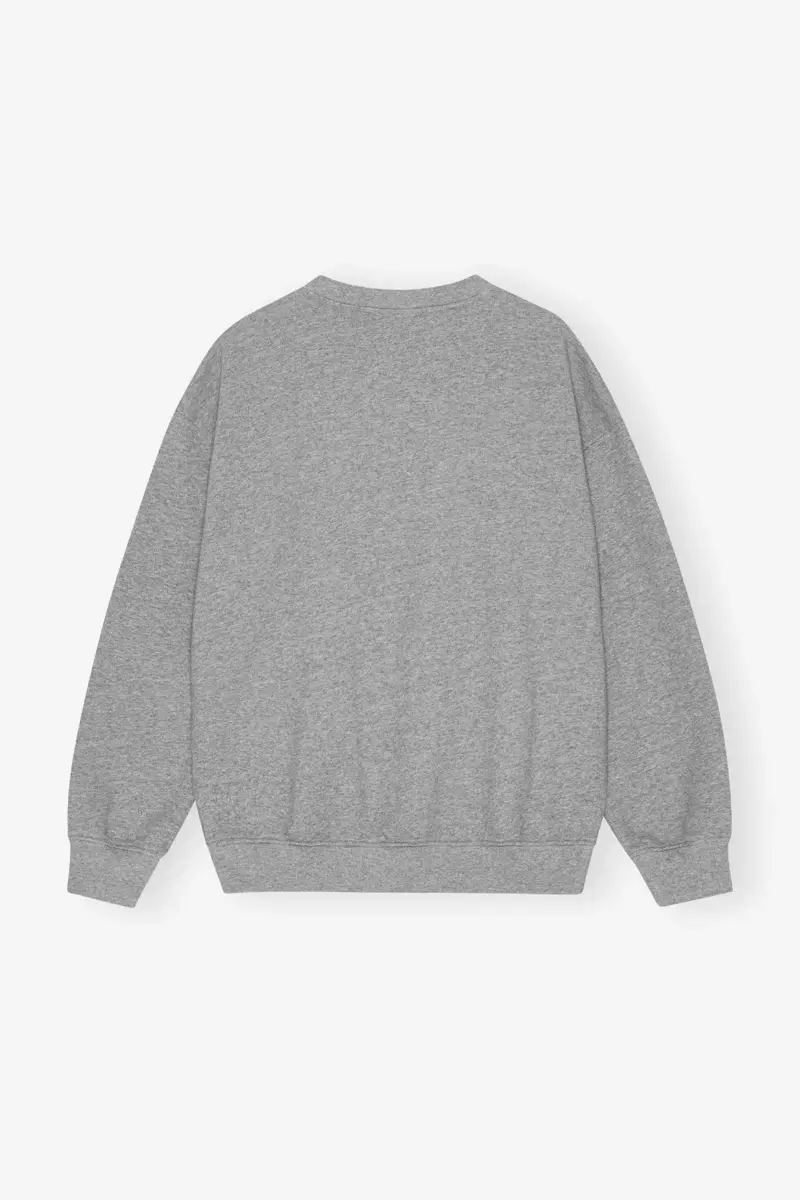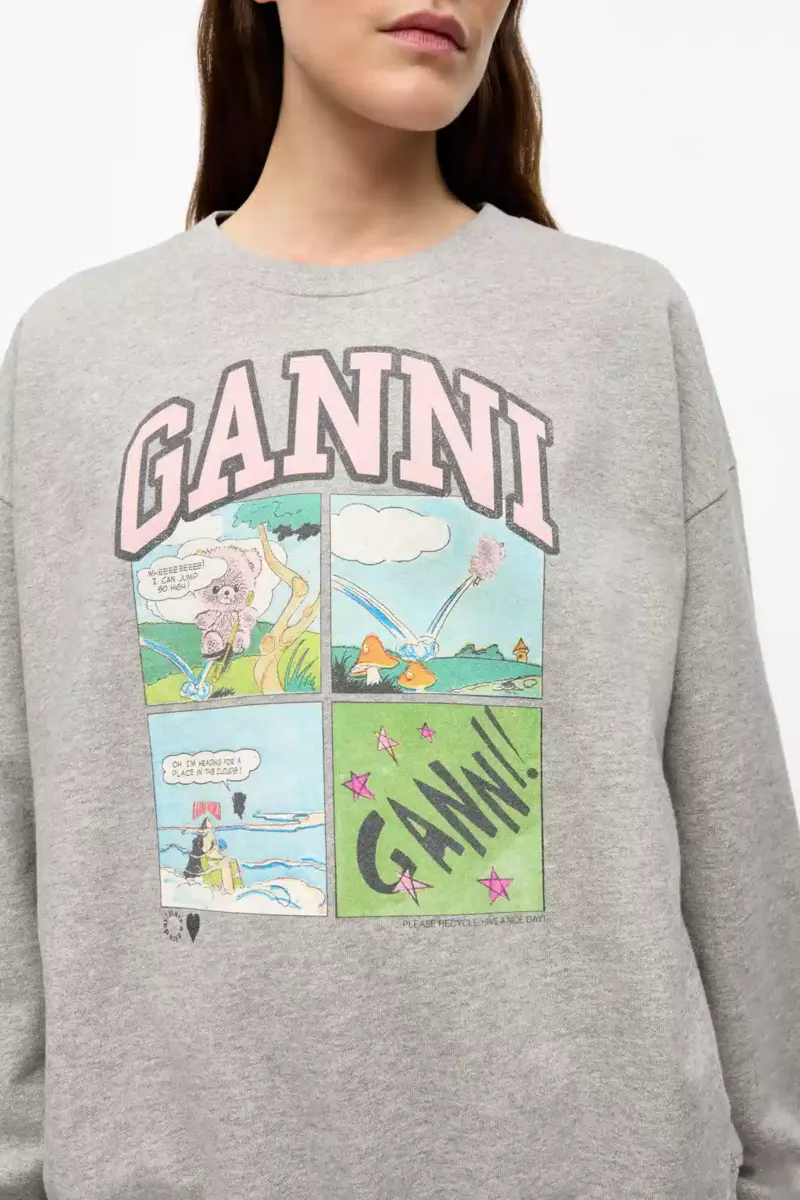 This Grey Isoli Oversized Sweatshirt features a crew neckline and long sleeves. The sweatshirt has ribbed edges and a graphic GANNI print.